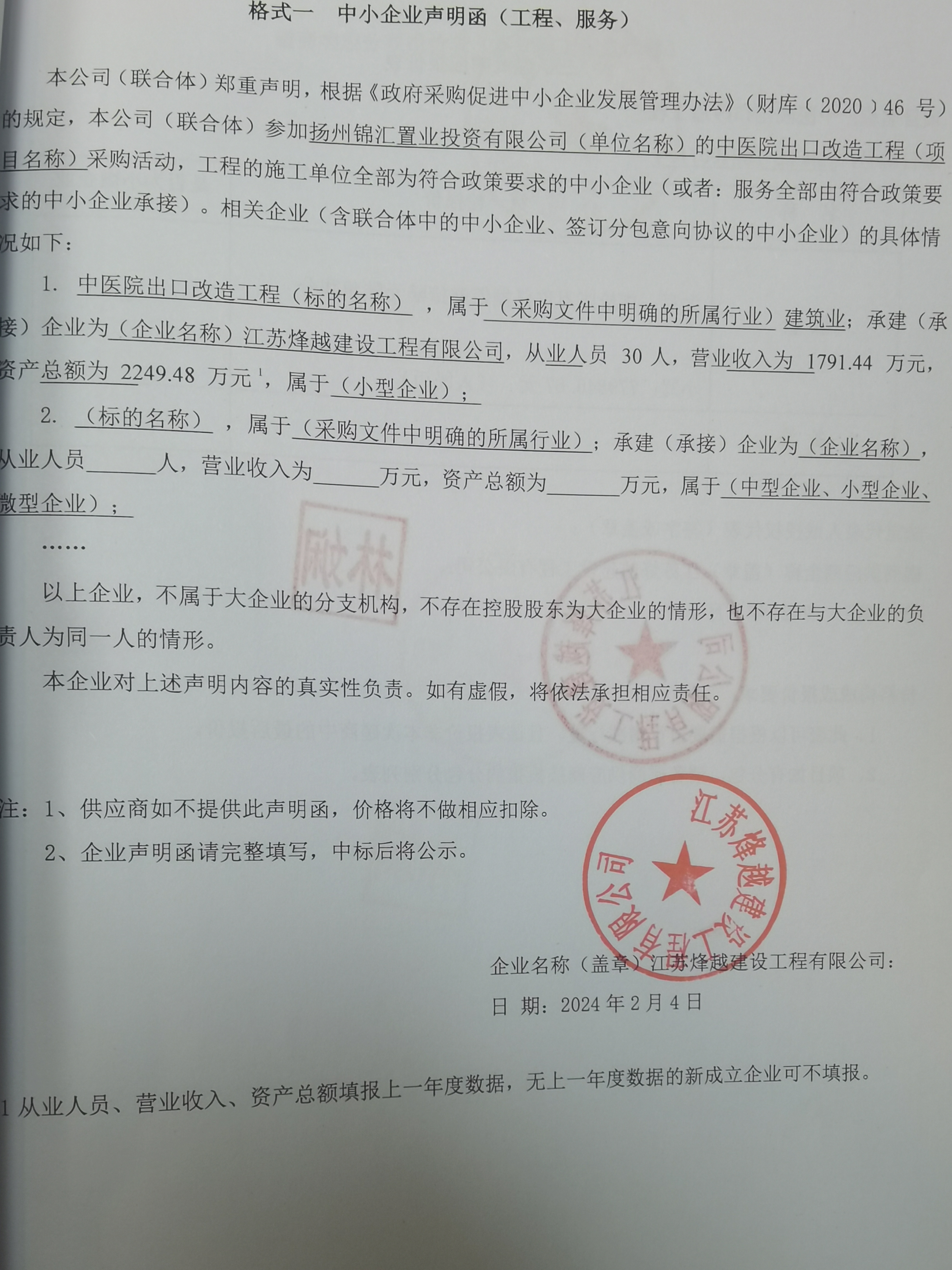 江蘇匯誠(chéng)投資咨詢管理有限公司受揚(yáng)州錦匯置業(yè)投資有限公司的委托,就中醫(yī)院出口改造工程進(jìn)行競(jìng)爭(zhēng)性磋商采購(gòu),現(xiàn)就本次磋商的成交結(jié)果公布如下: 一、項(xiàng)目編號(hào):JSHCZB-20240071 二、項(xiàng)目名稱:中醫(yī)院出口改造工程 三、成交信息: 供應(yīng)商名稱:江蘇烽越建設(shè)工程有限公司 供應(yīng)商地址:揚(yáng)州市廣陵區(qū)運(yùn)河南路158號(hào)(通運(yùn)商貿(mào)城)21-422 成交金額:人民幣766000元 四、主要標(biāo)的信息: 工程類 | 名稱:中醫(yī)院出口改造工程 施工范圍:包含但不限于工程施工圖紙及工程量清單范圍內(nèi)的所有工程施工 施工工期:30日歷天 項(xiàng)目經(jīng)理:范峻 執(zhí)業(yè)證書信息:蘇232181812599 |