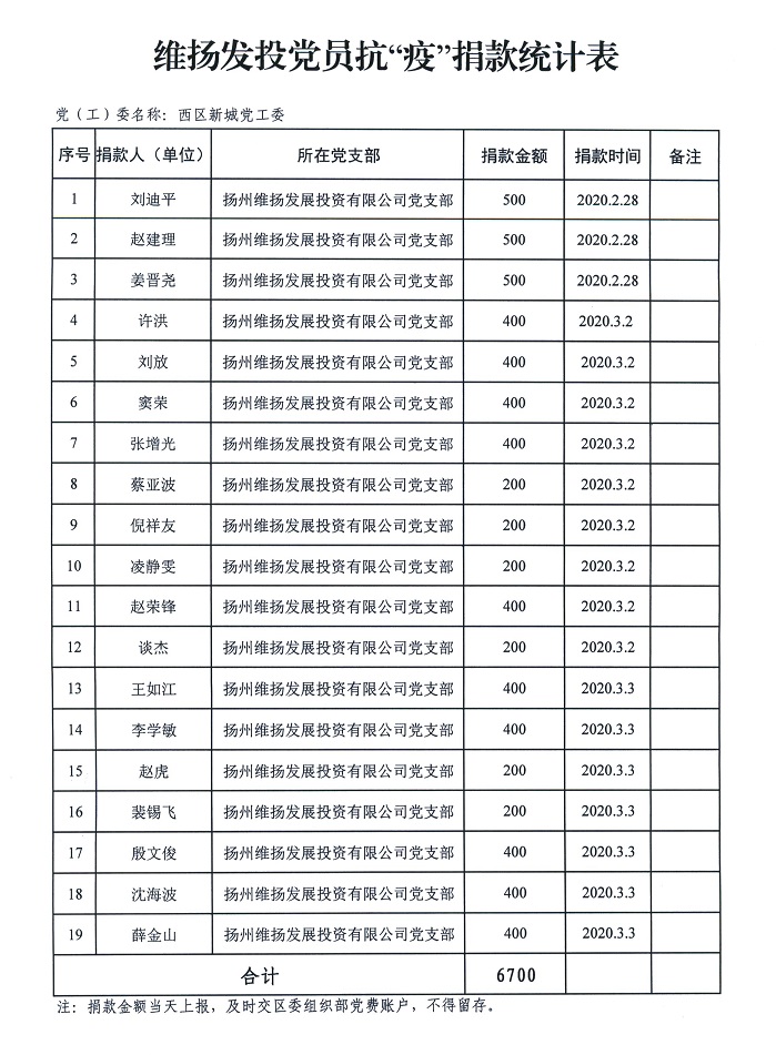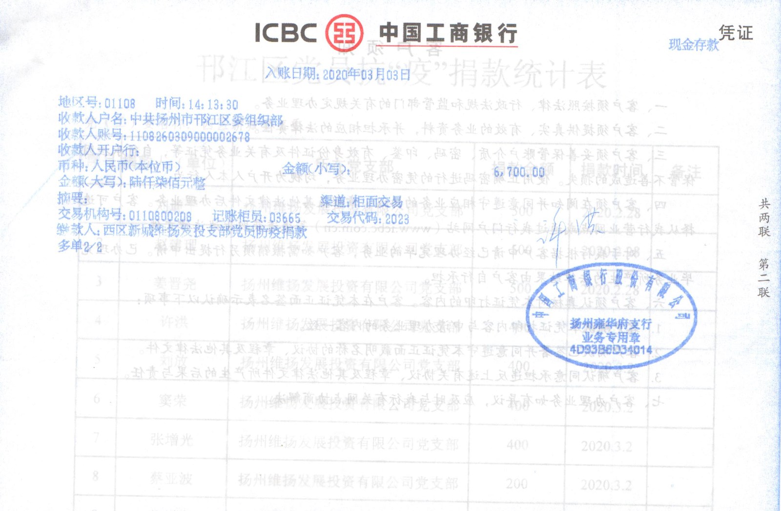 涓流不吝,以成江河。截止目前,公司黨支部一共向邗江區(qū)委組織部賬戶匯入黨員抗疫特殊黨費6700元。公司員工及合作單位也籌集了13400元的抗疫愛心捐款,匯款至邗江區(qū)紅十字會。