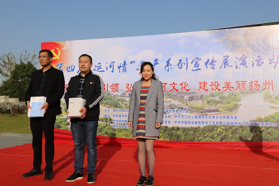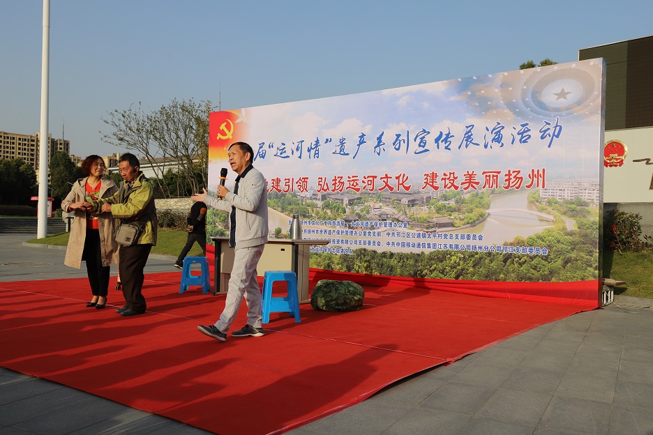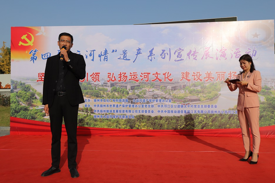 為充分發(fā)揮廣大市民在大運(yùn)河遺產(chǎn)保護(hù)、傳承和利用中的重要作用,深入挖掘大運(yùn)河的歷史、科學(xué)、文化價(jià)值,宣傳普及大運(yùn)河遺產(chǎn)知識,11月8日下午,在蜀岡體育公園舉辦了以“堅(jiān)持黨建引領(lǐng) 弘揚(yáng)運(yùn)河文化 建設(shè)美麗揚(yáng)州”為主題的第四屆“運(yùn)河情”遺產(chǎn)宣傳展演系列活動。 本次活動由揚(yáng)州市文化廣電和旅游局、大運(yùn)河遺產(chǎn)保護(hù)管理辦公室主辦,由中共揚(yáng)州市世界遺產(chǎn)保護(hù)管理辦公室支部委員會、中共揚(yáng)州市邗江區(qū)公道鎮(zhèn)太平村總支部委員會、中共揚(yáng)州維揚(yáng)發(fā)展投資有限公司支部委員會、中共中國移動通信集團(tuán)江蘇有限公司揚(yáng)州分公司邗江支部委員會、揚(yáng)州市大運(yùn)河保護(hù)志愿者總隊(duì)聯(lián)合承辦。 活動共有四個(gè)環(huán)節(jié):首先,由專業(yè)人士解讀大運(yùn)河文化帶建設(shè)相關(guān)政策和規(guī)劃。
